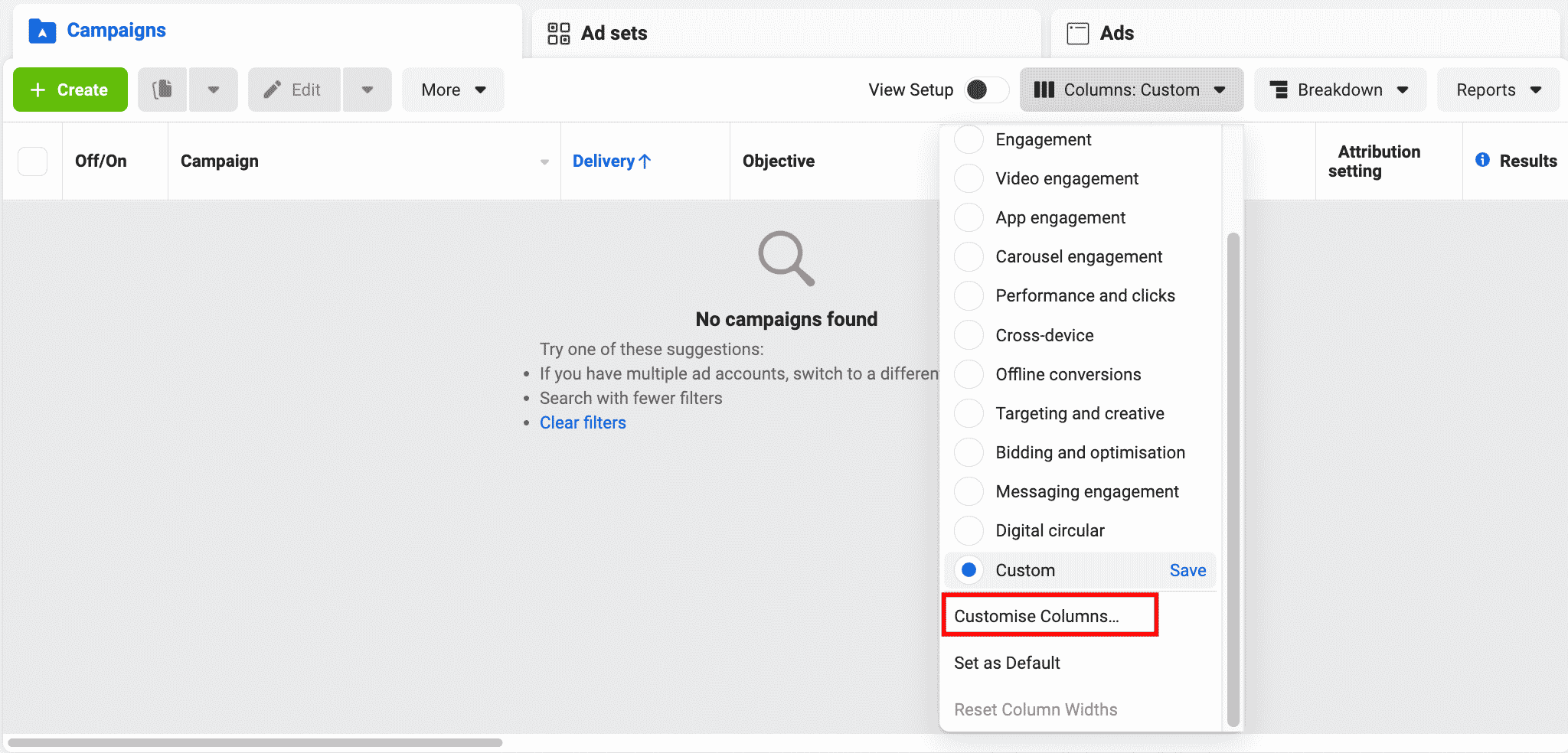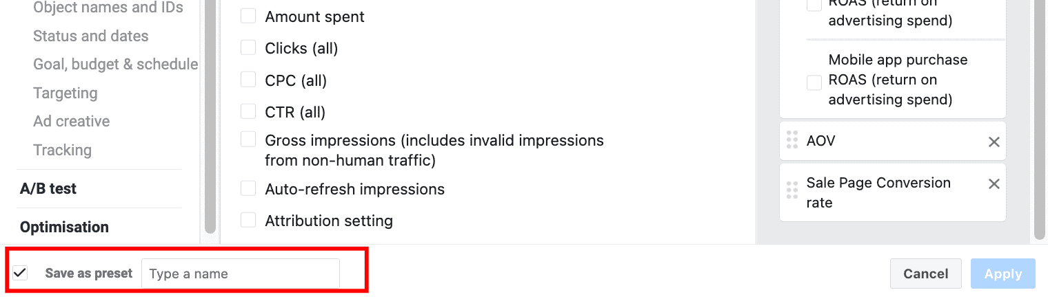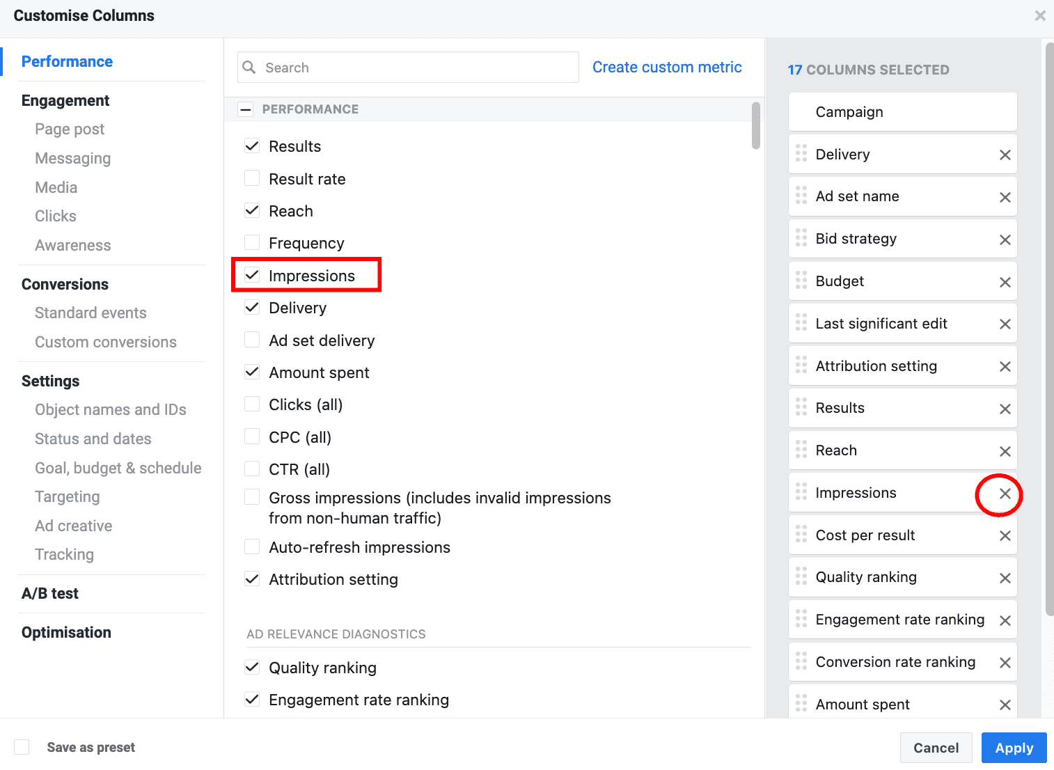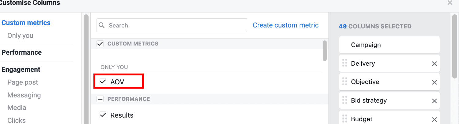 การตั้งค่ารายงานแบบกำหนดเอง (custom report) จะสามารถดูได้ทั้งในระดับ campaigns, ad sets และ ads ยกตัวอย่างเช่น การใช้ Conversion objective ในการเพิ่มประสิทธิภาพในการสร้างยอดขาย ซึ่งในการสร้าง custom report คลิกไปที่รูปคอลัมน์ขวามือ และจะเห็นเมตริกที่มีมาให้อยู่แล้ว เลือก “Performance” และเลือก “Customize Columns” ซึ่งจะปรากฎหน้าเมตริกที่เต็มไปหมด เราสามารถเลือกหรือลบ รวมทั้งจัดลำดับเมตริกใหม่ ตามที่ต้องการได้บนรายการนี้