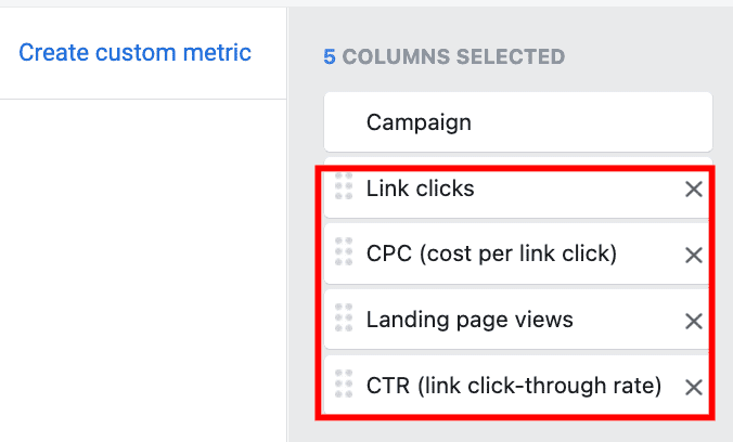 เมตริกนี้จะช่วยให้เรารู้ว่าจำนวนคนเข้าเว็บไซต์ด้วย Facebook ads และค่าใช้จ่ายเท่าไหร่ เริ่มจากเพิ่ม 4 เมตริกนี้เข้าไป ซึ่งเราสามารถใช้ Search box ในการค้นหาเมตริกที่ต้องการได้ง่ายขึ้น