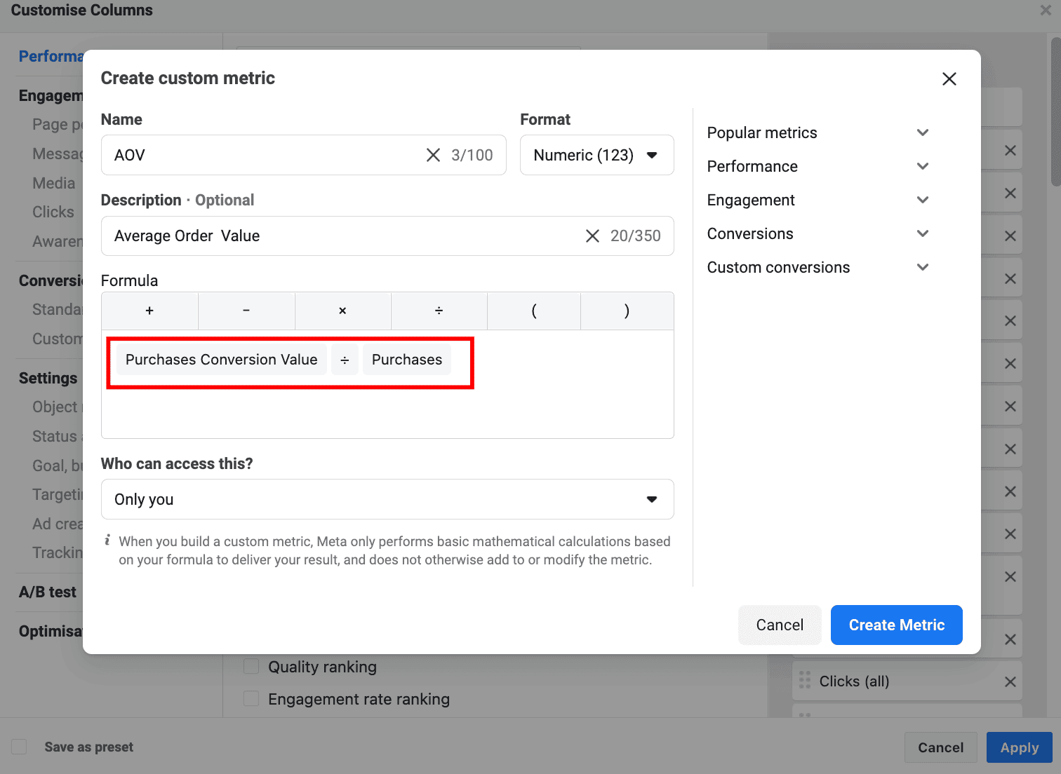 คลิกตรง formula เลือกหาเมตริกคำว่า Purchases Conversion Value และกดเครื่องหมายหาร ตามด้วยเมตริก Purchase หลังจากเลือกเรียบร้อยแล้วคลิก create metrics เราก็จะเห็นเมตริก AOV ขึ้นมาในหน้า customize column เลือกเครื่องหมายถูกตรงเมตริก AOV