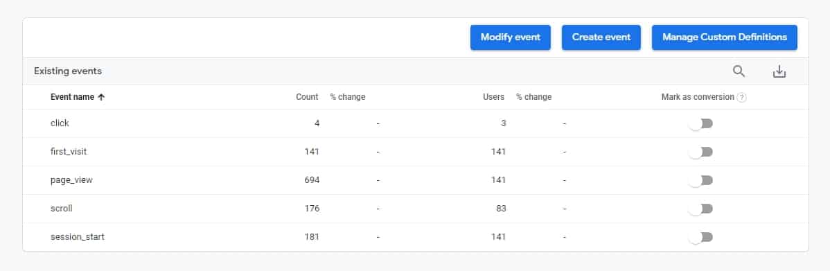 ในส่วนนี้จะทำหน้าที่บอกกับคุณว่าในเว็บไซต์ของคุณได้ทำการ Tracking Event อะไรบ้าง โดยเป็นอีเว้นท์ที่ Google Analytics 4 Property สามารถแทรคเองโดยอัตโนมัติผ่านระบบที่ชื่อว่า Enhanced Measurement รวมทั้งเป็นส่วนที่สามารถเอาไว้สร้าง Custom Event ของคุณเองโดยไม่ต้องทำผ่าน GTM แต่การสร้างอีเว้นท์ผ่าน Tag Manager ยังสามารถใช้ได้อยู่
