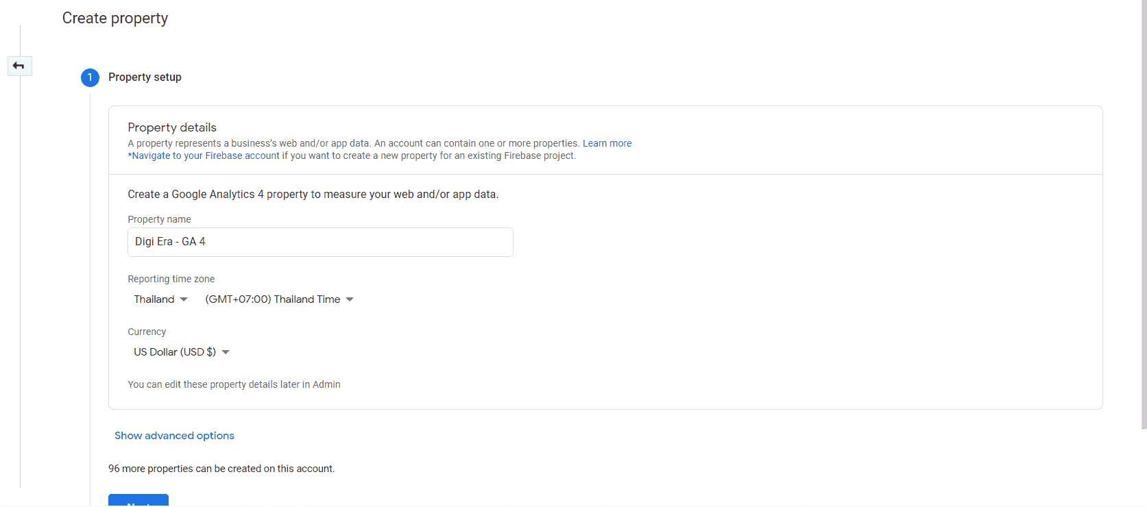 การตั้งค่าเบื้องต้นก็ไม่ต่างจากเดิมเท่าไหร่นัก ให้ตั้งชื่อ Property ได้ตามแต่ที่คุณต้องการ พร้อมทั้งเลือกประเทศ ส่วน Currency จะเลือกหรือไม่เลือกก็ได้ แต่อย่าเพิ่งที่จะคลิกต่อไปนะครับ เพราะคุณจะสร้างได้เพียงแค่ GA4 Property เพียงเท่านั้น ให้เลือกที่ Show Advanced Options ก่อนเพื่อให้มันแสดงผลออกมาเป็นแบบภาพด้านล่างครับ