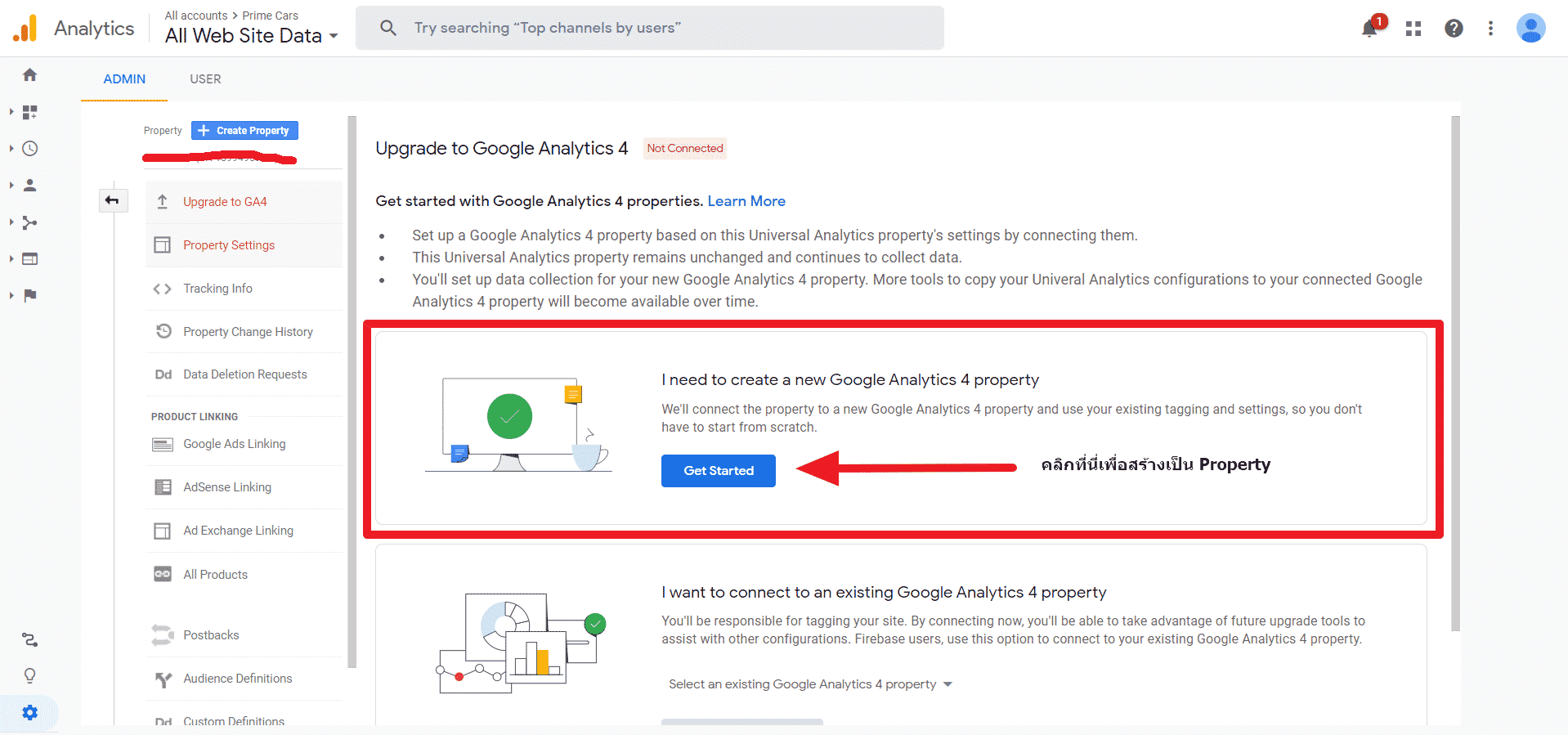 วิธีการด้านบนเป็นวิธีการสร้างผ่านการกดปุ่ม Upgrade to Google Analytics 4 แต่การสร้างนั้นมีด้วยกันสองแบบ อีกวิธีหนึ่งก็คือการสร้าง Property ใหม่เลย สามารถทำตามไปด้วยกันได้เลยนะครับ