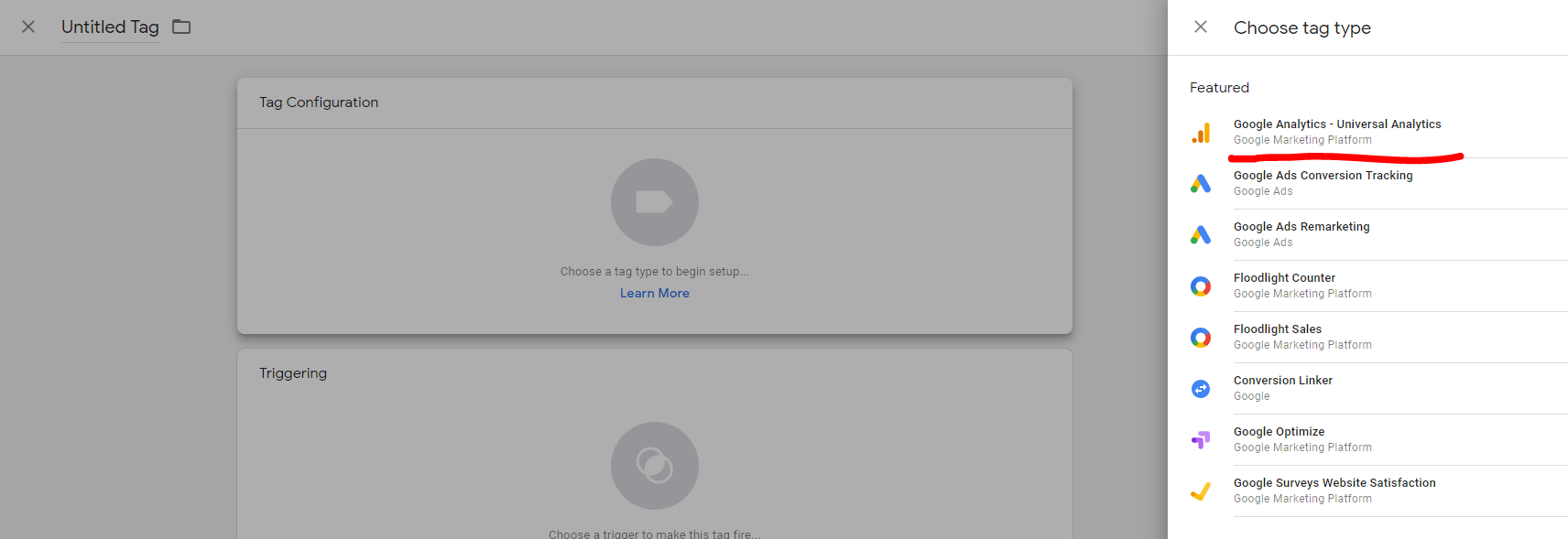 อันดับแรกให้คลิกไปที่คำว่า Tags (แท็ก) หลังจากนั้นให้คลิกไปที่ New เพื่อดูว่า Tag Manager สามารถที่จะติดตั้งอะไรได้บ้าง หลังจากนั้นให้เลือกเป็น Universal Analytics ตามภาพด้านล่าง