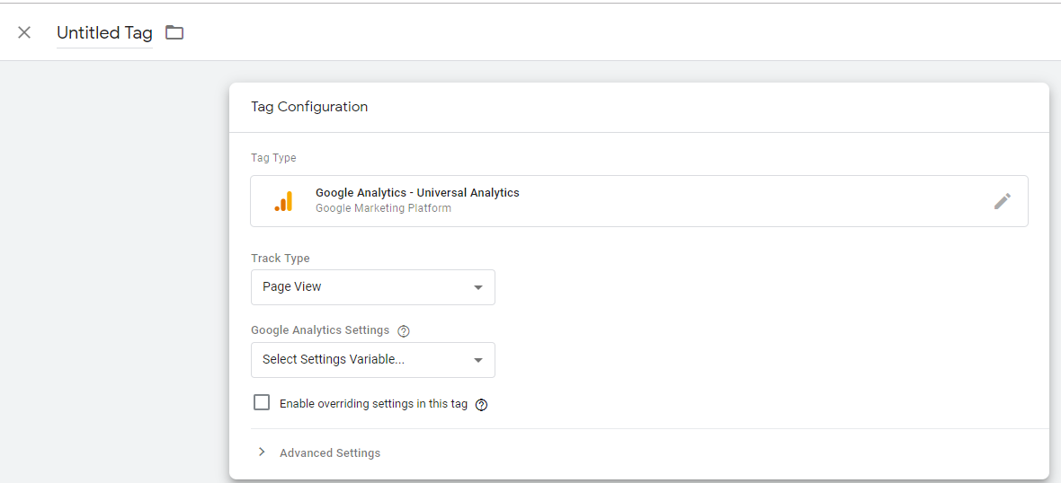 การตั้งค่า Google Analytics ก็ไม่ได้ยากสักเท่าไหร่ อันนี้ตรง Track Type ให้เลือกเป็น Page View เพราะตอนนี้เราต้องการที่จะเพียงแค่คนที่เข้ามายังเว็บไซต์เพียงเท่านั้น เราสามารถที่จะใส่ Universal Analytic ID (UAID) ได้ 2 ที่ โดยจะต้องเลือกแบบใด แบบหนึ่ง ห้ามใส่พร้อมกันไม่งั้นอาจจะไม่เห็นข้อมูลได้ ซึ่งได้อธิบายเอาไว้แล้วว่าทำไม ในบทความก่อนหน้านี้ – Google Analytic / Tag Manager ทำไมติดตั้งแล้วยังไม่ทำงาน?