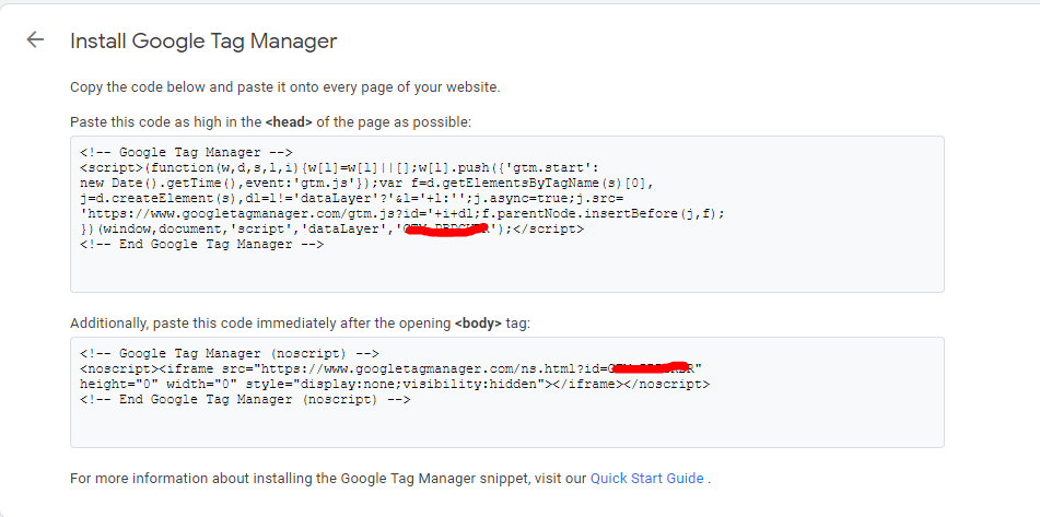 เมื่อเราได้สร้าง Account เรียบร้อยทาง Google จะสร้างโค้ด Java Script ขึ้นมาหนึ่งชุด รวมด้วยกับเลขที่เรียกว่า GTM ID เหมือนภาพด้านล่าง คุณจะต้อง Copy โค้ดนั้นไปลงในเว็บไซต์ในส่วนที่เรียกว่า “Header” และ “Body” เพื่อที่จะทำให้มันใช้งานได้นั่นเอง