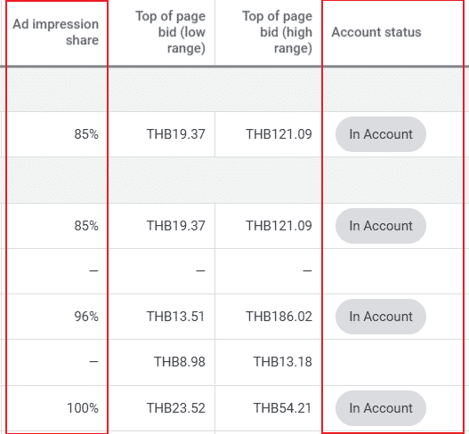 Ad Impressions Shared และ Account Status : สองอันนี้จะทำหน้าที่บอกกับคุรว่าคีย์เวิร์ดที่คุณได้หานั้น อาจจะเป็นคีย์เวิร์ดเดิมที่ได้ใส่เข้าไปในแคมเปญแล้ว และคีย์เวิร์ดดังกล่าวมียอด Impressions Shared อยู่ที่กี่เปอร์เซ็นต์ สำหรับใครมือใหม่สามารถอ่านเรื่อง Search Impressions Share ได้ที่นี่