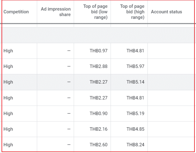 ข้ามมาฝั่งกรอบสีแดงกันบ้าง จะเห็นว่ามีคำศัพท์หลายอย่างเลย ทั้ง Competitions, Ad Impressions Share, Top of the Page Bid (low Range และ High Range) และ Account Status วันนี้เราจะเผยให้หมดเปลือก มาดูกันว่าแต่อย่างมีความหมายว่าอะไรกันบ้าง
