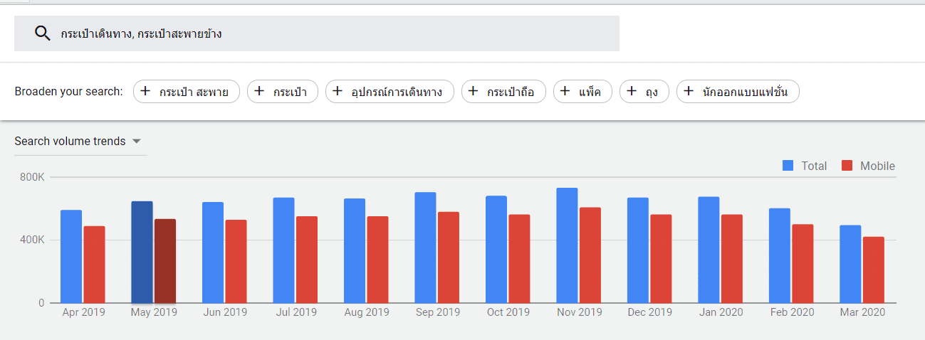 เมื่อกด Result แล้วเราจะเห็นเป็น Graph แท่งเหมือนภาพด้านบน โดยมันทำหน้าที่บอกว่าในแต่ละเดือนมีคนค้นหาโดยสรุปรวมทุกคีย์เวิร์ดเป็นจำนวนเท่าไหร่ โดยสีน้ำเงินเป็นจำนวนทั้งหมด ส่วนสีแดงก็จะเป็นจำนวนของคนที่ค้นหาผ่านโทรศัพท์มือถือนั่นเอง