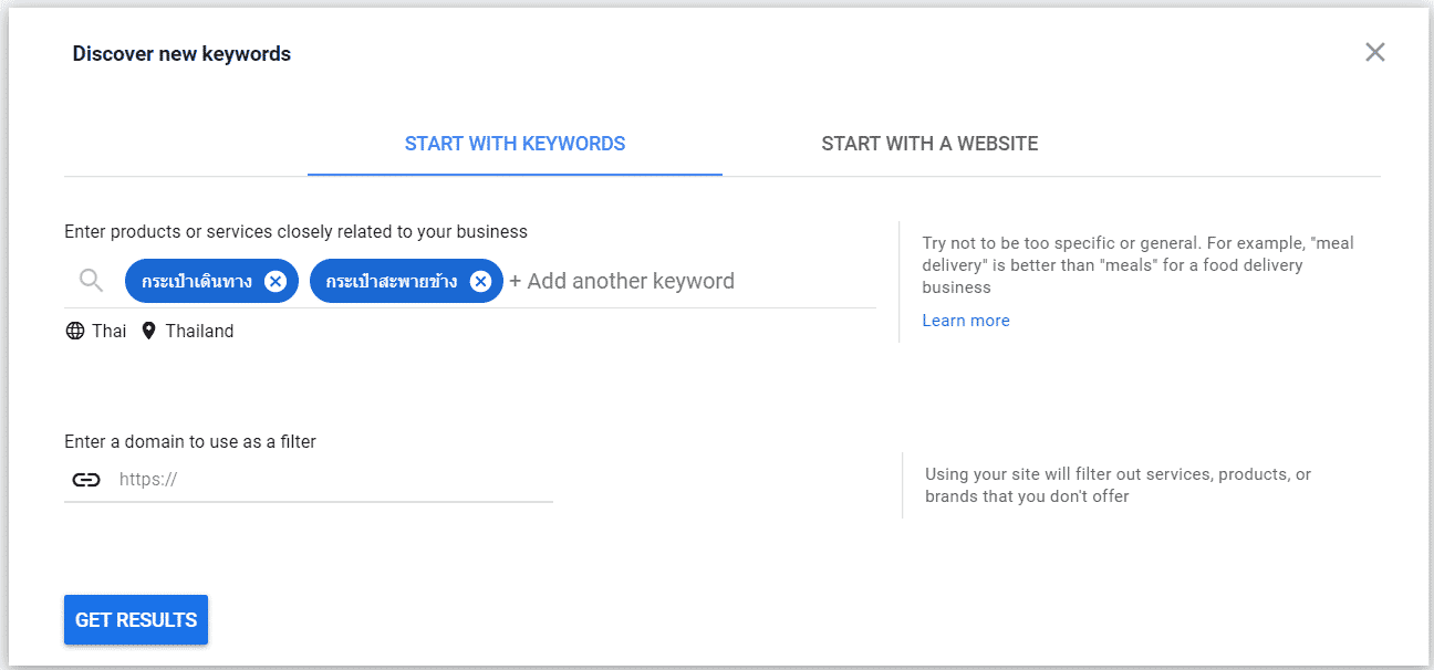 เกือบไปลืมไปว่าเรายังสามาถใช้ “Start With Website” ได้อีกด้วย หลักการง่ายๆ เลยก็เพียงแค่นำเว็บไซต์ของคุณเอง หรือของคู่แข่งมาวางใส่ แล้วคลิก “Get Result” ทาง Keyword Planner ก็จะนำเสนอคีย์เวิร์ดมาให้คุณได้เลือกใช้กัน