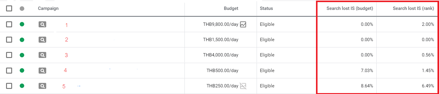 Lost Impression Share (Budget) อันนี้ไม่ต้องคิดอะไรมากนัก มันเป็นเหตุผลง่ายๆ ที่ว่าจำนวนเงินที่ใช้ในแคมเปญนั้นๆ มันน้อยจนเกินไป ถ้าแคมเปญกำลังเจอปัญหาตรงนี้ก็ต้องมีความจำเป็นที่จะต้องเติมเงินเข้าในแคมเปญเพื่อที่จะทำให้จำนวนคนเห็น Ads ของคุณมากขึ้นกว่าเดิม แต่คุณจะต้องดูก่อนว่าแคมเปญที่จะใส่ลงไปนั้น มันจะคุ้มขนาดไหน