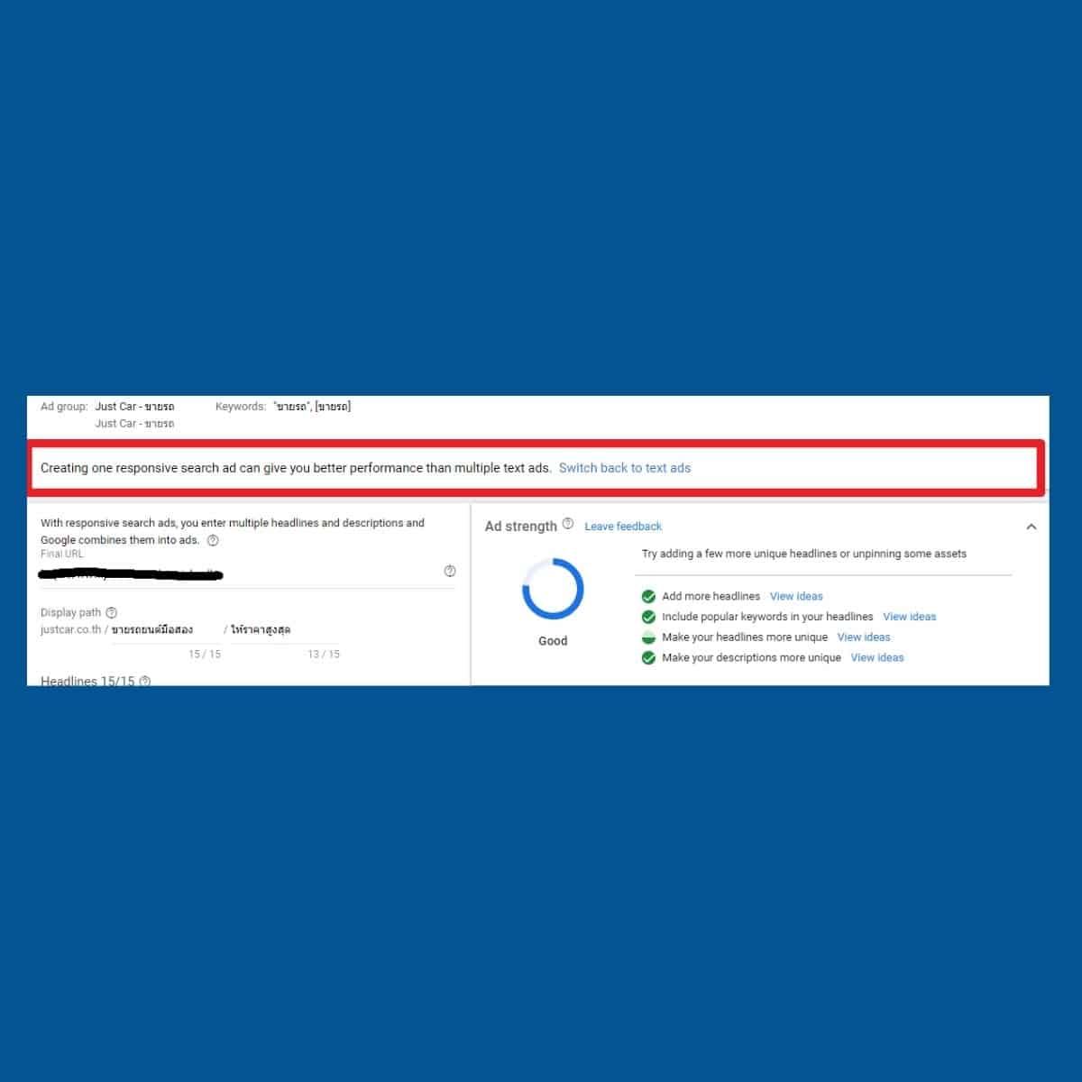 เมื่อผมลองสร้างแคมเปญแล้วนำจากตัวอย่างภาพด้านบนไปสร้างโฆษณาแบบ Responsive Search Ads ดูปรากฏว่ายังคงได้เพียงแค่ ‘Good’ เพียงเท่านั้น ถ้าจะปรับให้ได้ Excellence ได้นั้นค่อนข้างยากพอสมควร โดยเหตุผลหลักๆ ที่ทาง Google Ads ได้วิเคราะห์มาให้นั้นเป็นเพราะ Headline ที่เอามาใส่นั้นยังไม่ ‘Unique’ ดังนั้นทางระบบจึงได้ให้คำแนะนำมาเบื้องต้นว่าควรปรับอย่างไรได้บ้าง ทั้งนี้ฟังก์ชั่นนี้จะใช้ได้เฉพาะโฆษณาที่เป็นภาษาอังกฤษเสียส่วนใหญ่ สำหรับภาษาไทยอาจจะยังไม่รองรับ ในส่วนนนี้