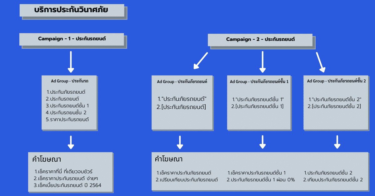 สมมติว่าเราให้บริการด้านการเปรียบเทียบราคาประกันรถยนต์ของบริษัทต่างๆ คีย์เวิร์ดที่เราจะใช้ก็จะมีอยู่ให้เลือกอย่างหลากหลาย ไม่ว่าจะเป็น คำว่าประกันภัยรถยนต์, ประกันรถยนต์, ประกันรถ หรือถ้าเป็น ประกันภัยรถยนต์ชั้น 1, ประกันรถชั้น 1, ประกันชั้น 1 เราจะวางโครงสร้างแคมเปญอย่างไรให้มันรู้สึกว่ามันจะส่งผลให้เราได้ ‘Leads’ ให้ได้เยอะที่สุด สามารถดูตัวอย่างได้จากภาพด้านล่าง